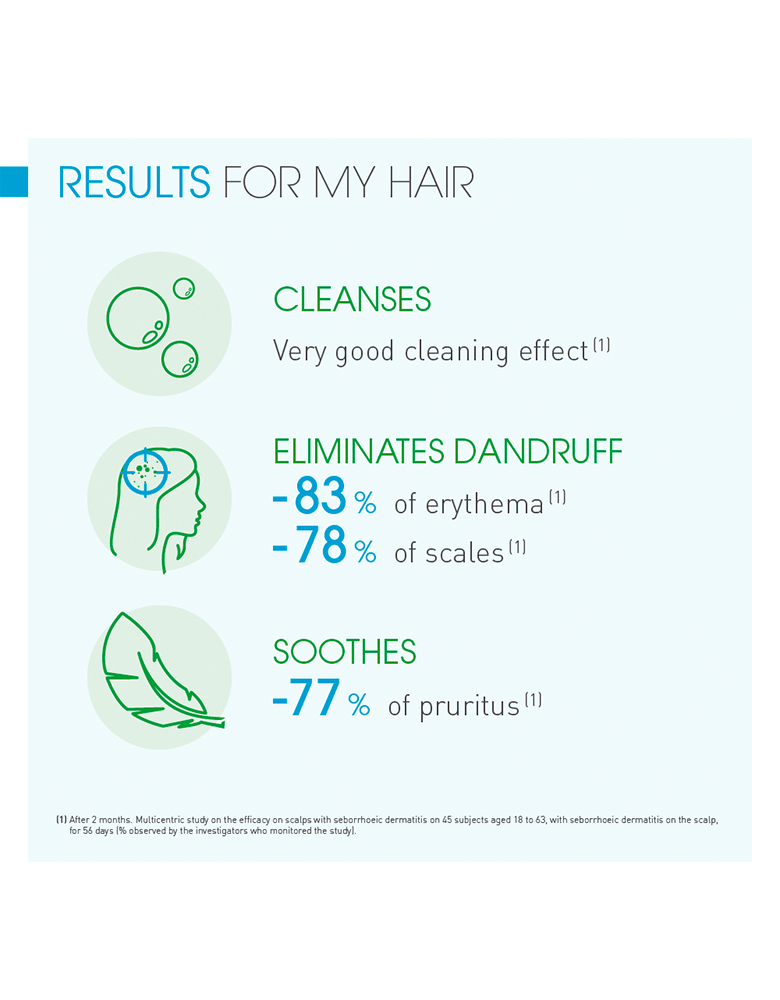 (1) Multicentric study on the efficacy on scalps with seborrhoeic dermatitis on 45 subjects aged 18 to 63, with seborrhoeic dermatitis on the scalp, for 56 days (% observed by the investigators who monitored the study).
