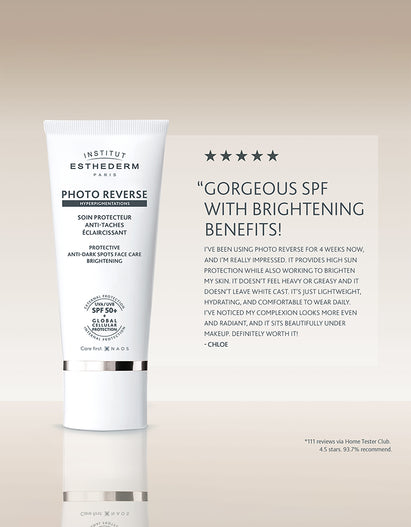 Institut Esthederm Photo Reverse Brightening SPF50+ Sun Cream is a unique daily sun protection moisturiser, protecting from the full spectrum of light (UVA/UVB/blue light/visible light/infra-red) reducing dark spots and hyper-pigmentation while brightening the skin even during sun exposure.