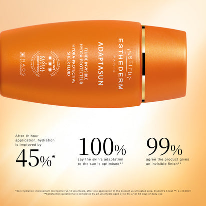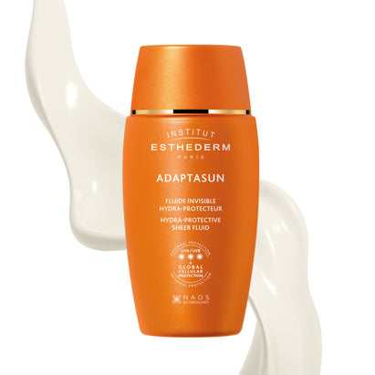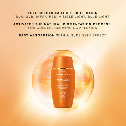 Institut Esthederm Adaptasun Hydra-Protective Sheer Fluid is a unique daily fluid moisturising sun protector guaranteeing fast, long-lasting and radiant tan. It protects from the full spectrum of light (UVA/UVB/blue light/visible light/infra-red) and free radicals, while allowing to achieve a beautiful golden glow. It optimises every stage of the pigmentation process (natural skin protection) and enhances the melanin production to give you a natural long-lasting tan whilst prolonging your skin’s longevity and prevent from photo-ageing.